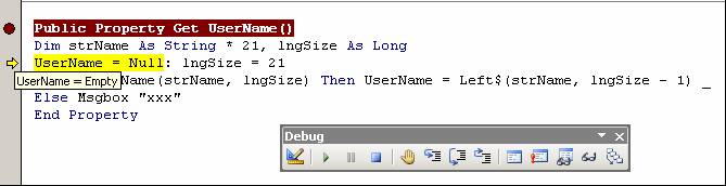 5. Просматривать результаты можно наведением мышью на пройденные (испытанные) выражения и переменные. Например в начале функции UserName видим, что UserName еще пуст (рис. 1), пройдя же все шаги и остановившись на End Property, видим, что UserName уже принял обработанное значение имени пользователя (рис. 2):