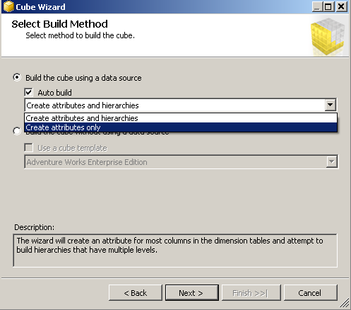 В окне Select Build Method указываем если Cube простой (Create attributes only) или с иерархиями (Create attributes and hierarchies): (подробнее об иерархиях есть в разделе Создать Dimension)