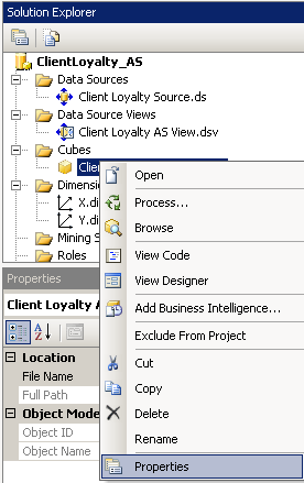 Открыть Solution Explorer, там найти и выделить куб, открыть его свойства (Properties):