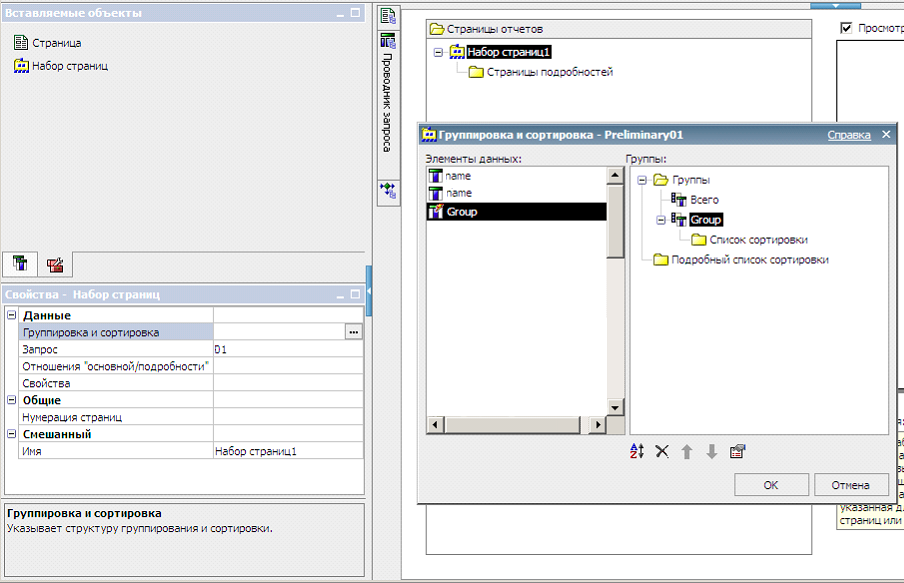 Пример задачи: разбить список на страницы, выводимые в формате Отчета (например, Excel) по заданной группировке, например, по значениям поля списка (см. ниже на рисунках создание набора страниц, который должен биться по значениям поля, в примере поле "Group"):