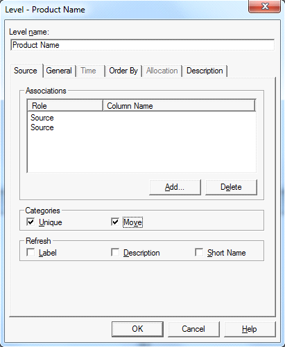 Категории всех измерений в кубе кэшируются в процессе наполнения / обновления категорий. Известно также, что большое количество категорий в измерении замедляет процесс наваривания куба. Если категорий много и это реальность, то куда деваться, но есть случаи, когда скэшированные категории не актуальны. От таких можно избавляться с помощью крыжиков Unique и Move (double click на уровень измерения –> закладка Source –> Cagerories –> включить галки Unique и Move), см. рис. ниже.