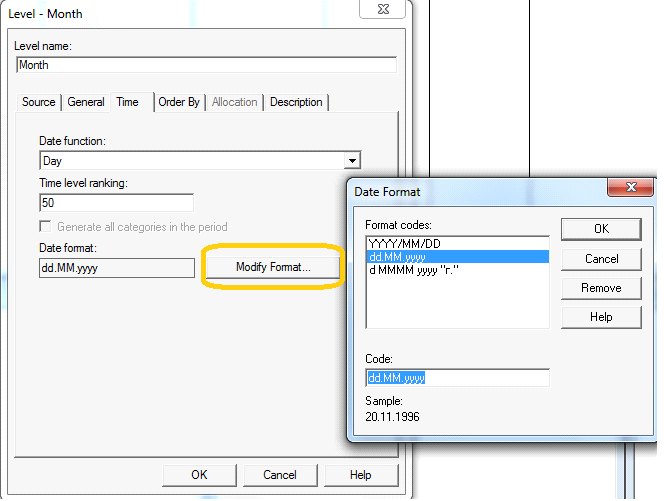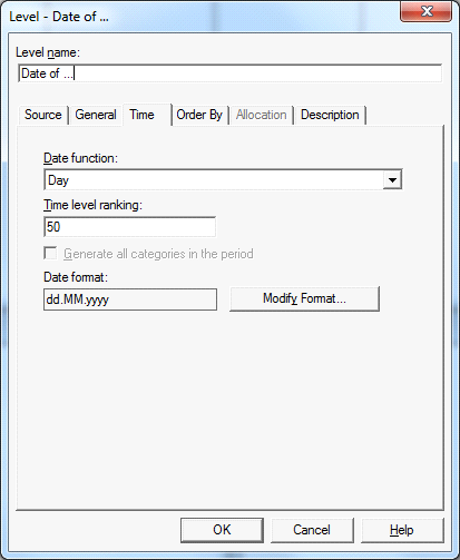 2.Изменить формат измерения, если требуется. Например на традиционный формат даты (double click на уровень измерения, в свойствах на закладке Time указать Date function, затем изменить формат с помощью Modify Format):