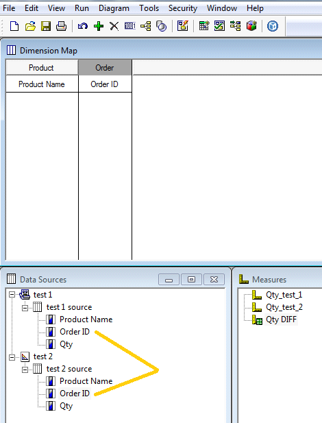 В приведенном примере ниже в двух источниках одноименным полем является [Order ID], по этому полю вяжутся источники [test 1 source] и [test 2 source]. Имея такую связь, можно вывести связанные факты (Qty из обоих источников, переименованные как Qty_test_1 и Qty_test_2) и вывести, например, разницу между ними (Qty DIFF) – после наполнения куба ее можно вывести как общую, так и в разрезе заданных измерений: