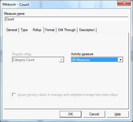 Например, есть факт, настроенный как Category Count какого-то измерения. Если по такому факту указать Activity Measure = All Measures (см. рис. ниже), то этот факт будет вычислен только для тех категорий, по которым не встречаются факты, равные null или нулю, полученные после RollUp-а. Но можно, также, в качестве Activity Measure вместо All Measures указать конкретный факт, по которому не может возникнуть null или ноль после RollUp-а ни по одной категории измерения.