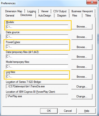 IBM Cognos Transformer –> File –> Preferences –> закладка Directories Укажите директорию хранения модели, куба, и журналов: