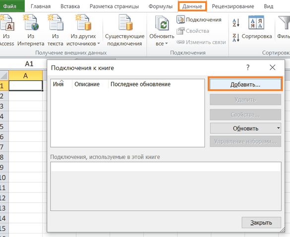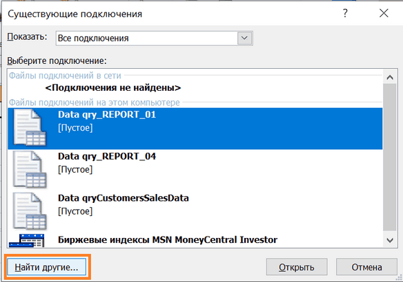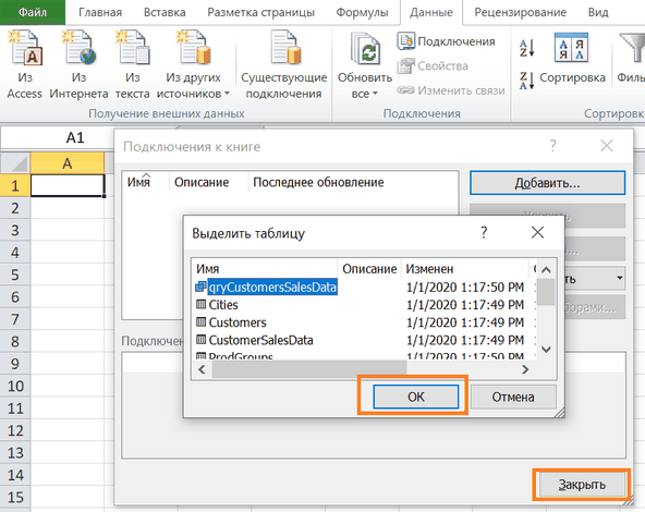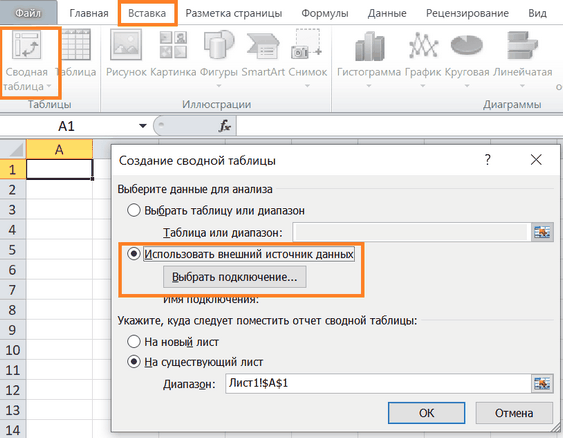 Меню: Вставка –> Сводная таблица –> Использовать внешний источник данных –> Выбрать подключение –> Указать добавленное –> ОК: