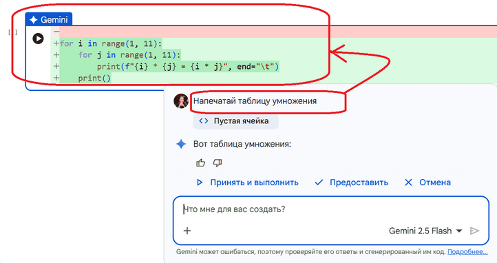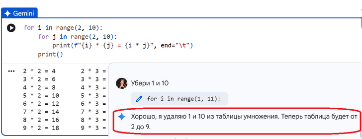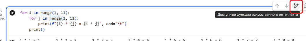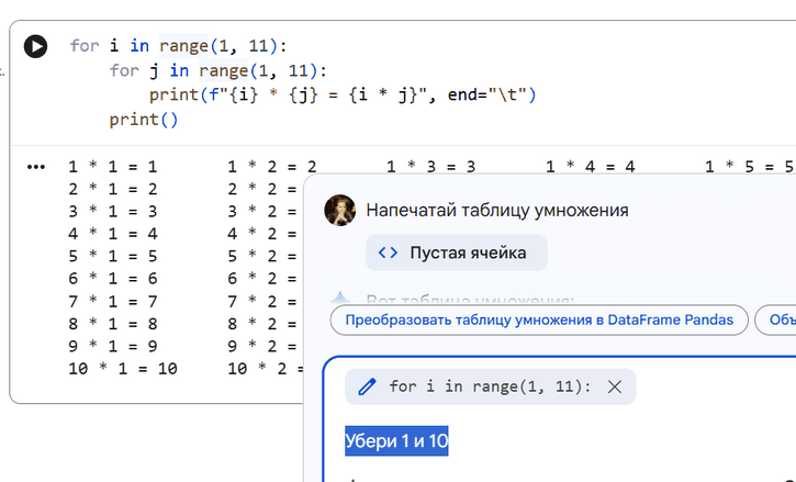 Итого, готов отлаженный с помощью ИИ код на питоне, генерирующий таблицу умножения: