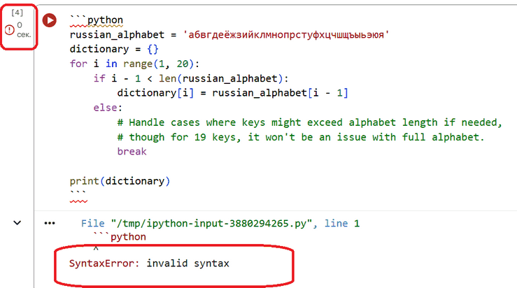 Готов отлаженный код, генерирующий словарь со ключами 1,2,3,.. и значениями в виде букв русского алфавита.