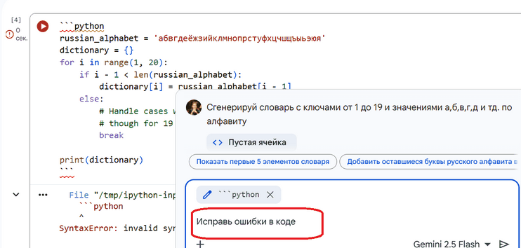 Ошибку можно исправить самому, а можно попросить ИИ сгенерить код снова (тот же запрос) или попросить Исправить ошибки в коде в контексте Преобразовать код: