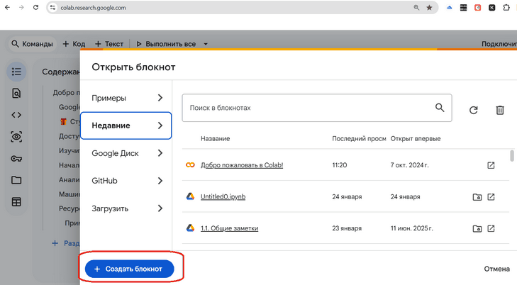 Открываю Google Colaboratory, далее Создать блокнот: