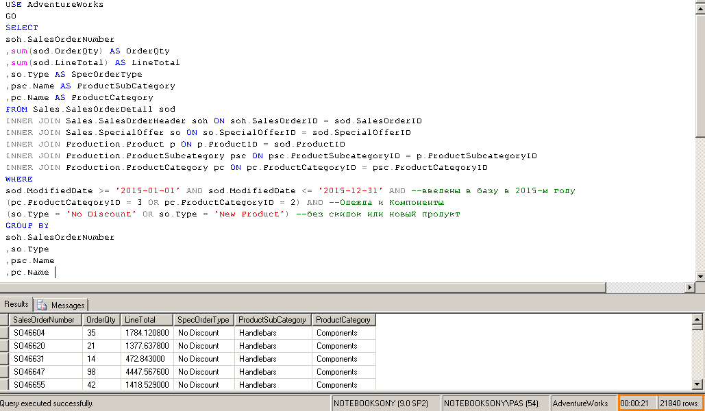 USE AdventureWorks GO SELECT soh.SalesOrderNumber ,sum(sod.OrderQty) AS OrderQty ,sum(sod.LineTotal) AS LineTotal ,so.Type AS SpecOrderType ,psc.Name AS ProductSubCategory ,pc.Name AS ProductCategory FROM Sales.SalesOrderDetail sod INNER JOIN Sales.SalesOrderHeader soh ON soh.SalesOrderID = sod.SalesOrderID INNER JOIN Sales.SpecialOffer so ON so.SpecialOfferID = sod.SpecialOfferID INNER JOIN Production.Product p ON p.ProductID = sod.ProductID INNER JOIN Production.ProductSubcategory psc ON psc.ProductSubcategoryID = p.ProductSubcategoryID INNER JOIN Production.ProductCategory pc ON pc.ProductCategoryID = psc.ProductCategoryID WHERE sod.ModifiedDate >= '2015-01-01' AND sod.ModifiedDate <= '2015-12-31' AND --ââåäåíû â áàçó â 2015-ì ãîäó (pc.ProductCategoryID = 3 OR pc.ProductCategoryID = 2) AND --Îäåæäà è Êîìïîíåíòû (so.Type = 'No Discount' OR so.Type = 'New Product') --áåç ñêèäîê èëè íîâûé ïðîäóêò GROUP BY soh.SalesOrderNumber ,so.Type ,psc.Name ,pc.Name