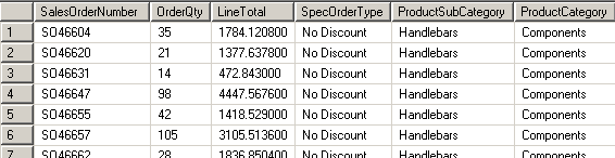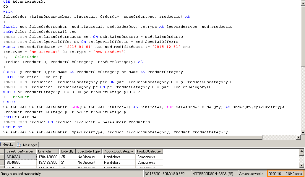 USE AdventureWorks GO WITH SalesOrder (SalesOrderNumber, LineTotal, OrderQty, SpecOrderType, ProductID) AS ( SELECT soh.SalesOrderNumber ,sod.LineTotal ,sod.OrderQty ,so.Type AS SpecOrderType ,sod.ProductID FROM Sales.SalesOrderDetail sod INNER JOIN Sales.SalesOrderHeader soh ON soh.SalesOrderID = sod.SalesOrderID INNER JOIN Sales.SpecialOffer so ON so.SpecialOfferID = sod.SpecialOfferID WHERE sod.ModifiedDate >= '2015-01-01' AND sod.ModifiedDate <= '2015-12-31' AND (so.Type = 'No Discount' OR so.Type = 'New Product') ), --SalesOrder