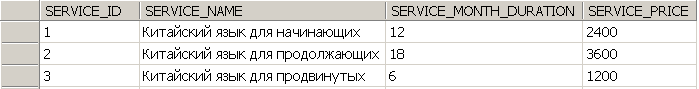 Таблица SERVICES (перечень предоставляемых услуг):