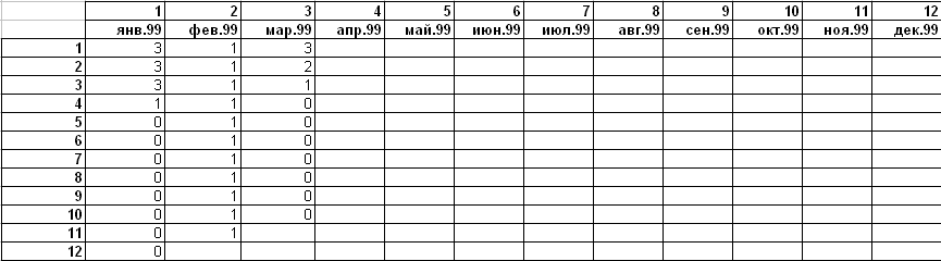 Заполним вручную вспомагательную таблицу с координатами данных по фактам оплаты услуги: по оси X будет координата от 1 до 12 как месяц начала оказания услуги; по оси Y будет координата от 1 до 12 как порядковый номер месяца оплаты:
