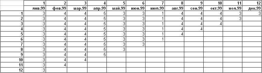Вот такой была бы идеальная картина лояльности на протяжении календарного года (январь 1999 – декабрь 1999):