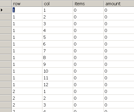 Заполним рабочую таблицу LOYALTY_REPORT_POSITION_DATA данными о колонках отчета (деления по оси X - количество месяцев в рассматриваемом периоде) и о строках (деления по оси Y – создадим 12 строк, чтобы понаблюдать лояльность по оплатам всего года от оплат первого месяца). Макет таблицы выглядит так: col:row - координата, где row - строка (ось Y); col - колонка (ось X); items - количество, приходящееся на координату col:row по факту оплаты услуги; amount - сумма оплаты, приходящаяся на координату col:row по факту оплаты услуги: