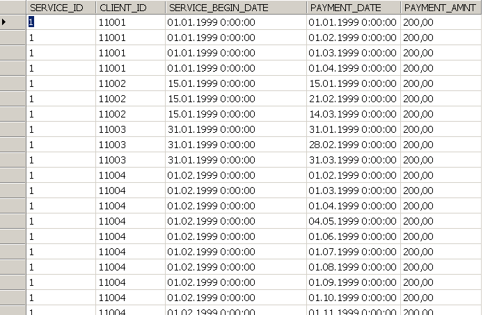 Информация о первых и очередных оплатах договора поступает в таблицы базы данных. Пусть это БД, состоящая из двух справочников (CLIENTS и SERVICES) и одной таблицы – с фактами оплаты услуг (SERVICE_FACTS).