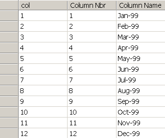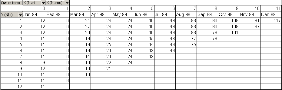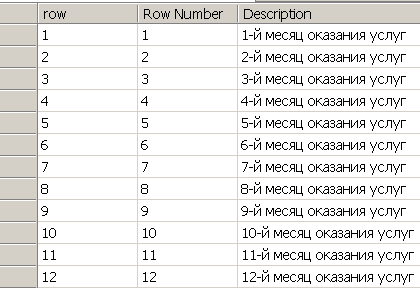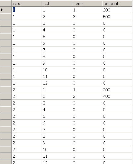 Следующая задача – разработать процедуру формирования данных к отчету, заполнить полученный макет рабочей таблицы количествами и денежными суммами по данным таблицы фактов оплат (SERVICE_FACTS), так чтобы каждая оплата проверялась к какой она относится координате (X - месяц начала оказания услуги; Y – месяц, за который услуга оплачена) и в соответствии с результатом проверки проставлялясь бы в соответствующую ячейку макета. Например, услуга с датой начала 01.01.1999, оплаченная за февраль 1999 запишется в виде единицы в колонку items по колонке row = 2, т.к. февраль – 2-й месяц по порядку от начала оказания услуги и по колонке col = 1, т.к. январь – первый месяц в рассматриваемом периоде. Если еще один клиент оплатил услугу за февраль-99, начало которой январь-99, то в эту же ячейку items, где row = 2 и col = 1 запишется еще одна единица и в ячейке будет уже 2 item-а. И так далее. Аналогичным образом заполнится и колонка по суммам оплат.