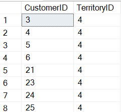 USE AdventureWorks GO --есть список клиентов и территорий SELECT CustomerID, TerritoryID FROM [Sales].[Customer] --для наглядности берём одну какую-то территоррию и несколько каких-то клиентов: WHERE TerritoryID = 4 AND CustomerID IN (3, 4, 5, 6, 21, 23, 24, 25)