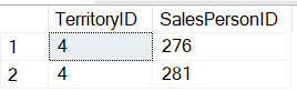--есть список менеджеров и территорий SELECT TerritoryID, SalesPersonID FROM [Sales].[SalesPerson] WHERE TerritoryID = 4
