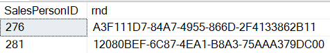 --1. Вывести случайное число напротив каждого SalesPersonID SELECT SalesPersonID, newid() AS rnd FROM [Sales].[SalesPerson] WHERE TerritoryID = 4 order by rnd