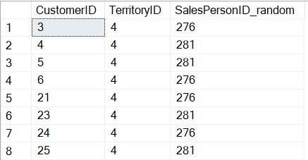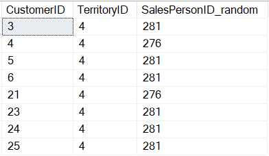 ) AS SalesPersonID_random FROM [Sales].[Customer] WHERE TerritoryID = 4 AND CustomerID IN (3, 4, 5, 6, 21, 23, 24, 25)
