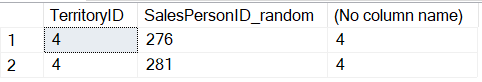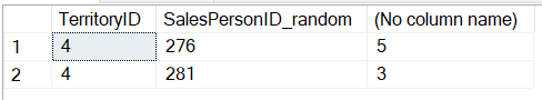 --4. Проверить: SELECT TerritoryID, SalesPersonID_random, COUNT(*) FROM ( SELECT CustomerID, TerritoryID, (SELECT top 1 SalesPersonID FROM [Sales].[SalesPerson] WHERE [Sales].[SalesPerson].TerritoryID = [Sales].[Customer].TerritoryID order by newid(), CustomerID) AS SalesPersonID_random FROM [Sales].[Customer] WHERE TerritoryID = 4 AND CustomerID IN (3, 4, 5, 6, 21, 23, 24, 25) ) AS grouped GROUP BY TerritoryID, SalesPersonID_random order by TerritoryID