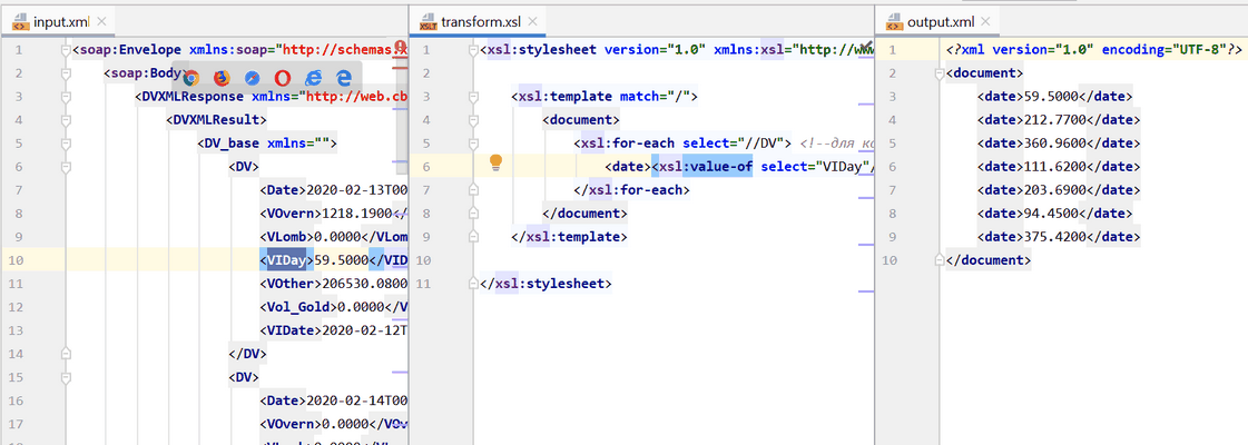 ➢Работать с XML-документами, разрабатывать, отлаживать и запускать XSLT-шаблоны, ➢Выводить на один экран в вертикальном разделении сразу 3 файла: входящий XML, XSLT-шаблон, исходящий XML, например: