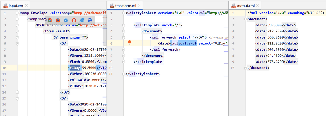 Это очень круто! Я вижу на одном экране входящий XML, XSLT-шаблон и исходящий XML!