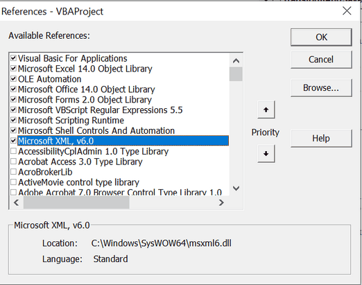Для работы с XML в VBA, нужно включить Microsoft XML, vN.N (Tools –> References)